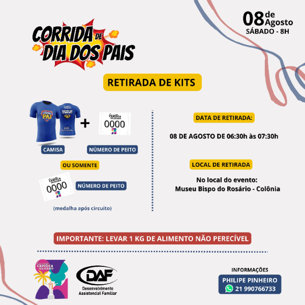 📅 Data: 08/08/2026📍 Local: Colônia — Museu Bispo do Rosário🧭 Endereço: Estrada Rodrigues Caldas, 3400 — Curicica⏰ Horários:• 🟢 Largada Corrida/Caminhada: 08:00• 🟣 Largada Kids: 09:00⚠️ Observação: evento sem chip de cronometragem.