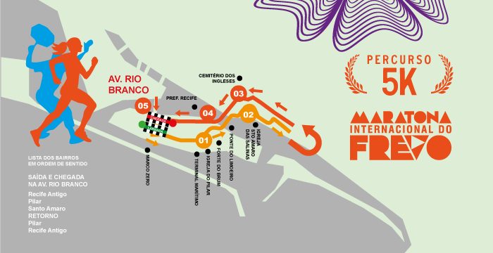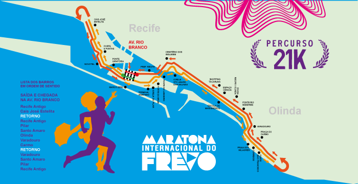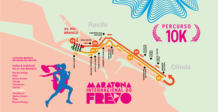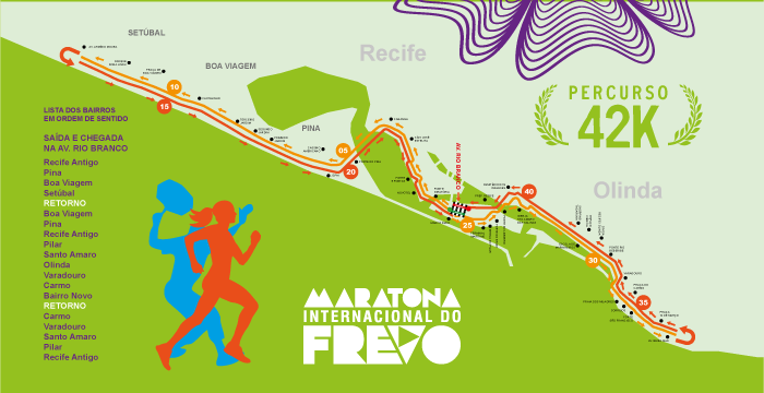 A Maratona Internacional do Frevo 2026 é uma celebração do esporte, da cultura e da energia contagiante do Recife! No dia 29 de março de 2026, o Recife Antigo será palco de um dos maiores eventos de corrida de rua do Brasil, reunindo atletas de todo o mundo em diferentes distâncias. Largadas: 42K às 4h, 21K às 4h30, 10K e 5K às 6h. Local: Cais da Alfândega – Recife Antigo. ✨