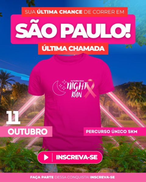 A Corrida Outubro Rosa NIGHT RUN, é uma ação que une saúde, esporte e solidariedade. Com o objetivo de reforçar a importância da prevenção e do diagnóstico precoce do câncer de mama, o evento reúne pessoas de todas as idades em um momento de conscientização e apoio à causa.